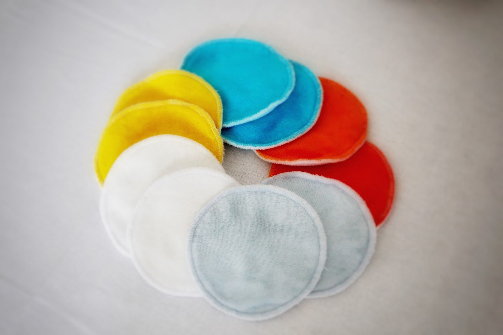 Die Stilleinlagen von Petit Lulu gibt es in der farbigen Variante und in der neutralen weißen Variante. Nathalie von Fluffy Mail hat mir die bunten Stilleinlagen zugeschickt. Es gibt sie jeweils im 5er Pack. Sie haben einen Durchmesser von 11-12 cm und sie bestehen aus drei Schichten. Die erste Schicht ist aus Velour, mit 20% Polyester und 80% Baumwolle, die zweite Schicht ist aus 60% Bambusviskose und 40% Biobaumwolle und die dritte Schicht ist aus Fleece aus 100% Polyester.